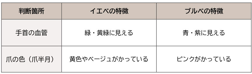 また、爪の生え際(爪半月)の色も判断材料になります。ピンクがかっているとブルベ、黄色やベージュがかっているとイエベと言われています。これらの方法は、自然光の下で行うのがポイントです。蛍光灯や電球の光だと色が歪んで見えるため、窓際など自然光が入る場所で確認しましょう。