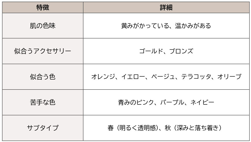一方で、青みの強いピンクやパープルなどの寒色系は、肌との相性が悪く、顔色が冴えない印象になりがちです。イエベの中でも、明るく透明感のある「春タイプ」と、深みと落ち着きのある「秋タイプ」に分かれます。日本人に多いタイプと言われており、特に秋タイプは和服にも合いやすい特徴があります。