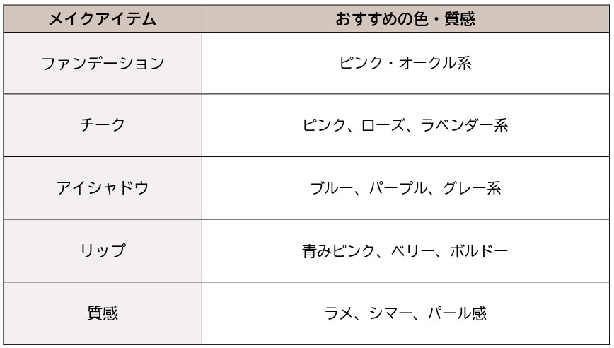 リップは青みピンクやベリー系など、クールな印象の色が映えます。特に冬タイプの方は、鮮やかなフューシャピンクやボルドーなども素敵です。メイクの質感は、ラメやシマー、パール感のあるものが相性が良いでしょう。肌悩みがある場合は、グリーンやパープルのコントロールカラーで、そばかす原因となる色素沈着や黄ぐすみをカバーするのがおすすめです。
