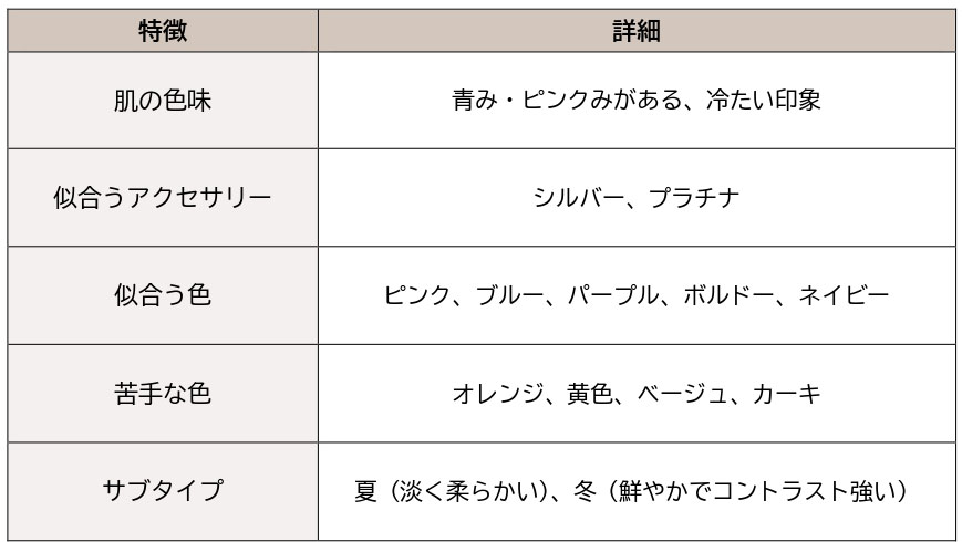 ブルベ(ブルーベース)の肌は、青みやピンクがかった色味が特徴です。肌のトーンは冷たい印象で、シルバーのアクセサリーが映えます。ピンク系やブルー系、パープルなどの寒色系のメイクや洋服が似合い、顔色を明るく健康的に見せてくれます。