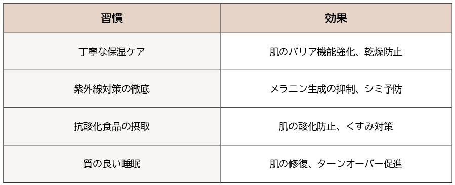 睡眠は肌の修復に不可欠なプロセスです。質の良い睡眠を確保することで、すっぴんでも輝く肌に近づけます。また、空気の乾燥も注意が必要です。特に冬場や空調の効いた室内では、こまめな保湿とともに、加湿器の使用もおすすめです。