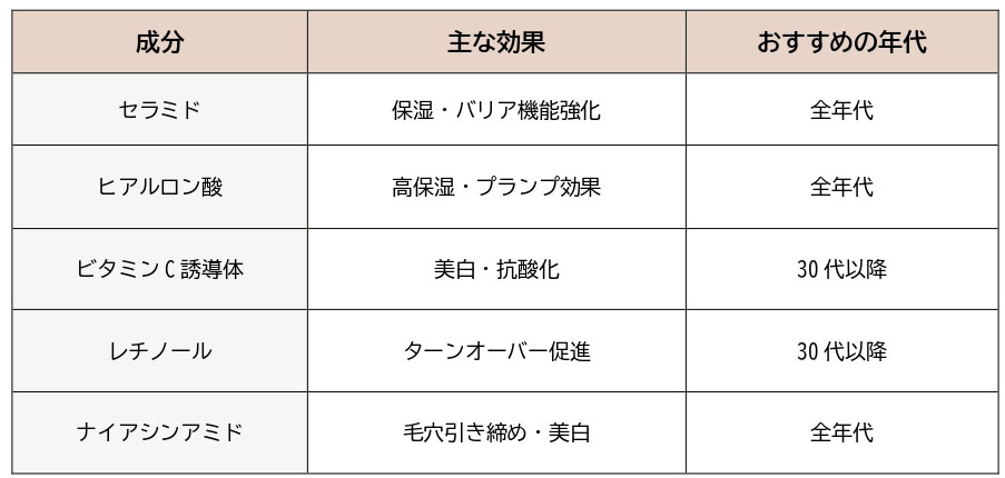 - 50代以降:エイジングケア成分と日常の保湿強化