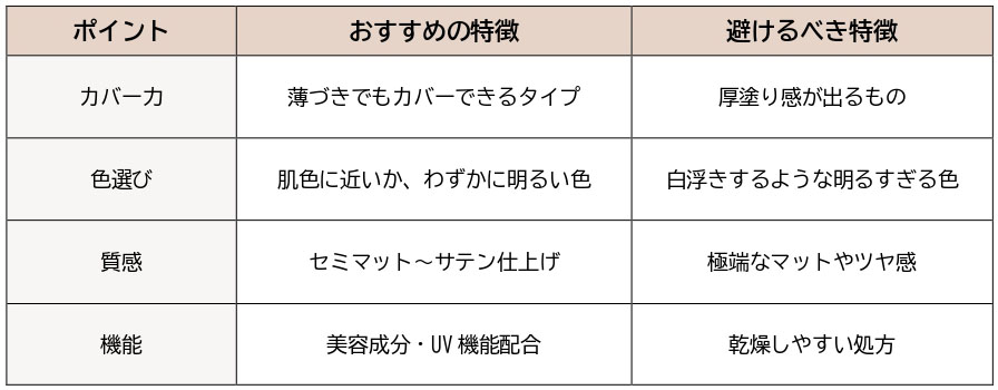 質感選びも重要なポイントです。マットすぎると光の反射が少なく、透明感が出にくくなります。かといって、ツヤが強すぎると油っぽく見えることも。セミマットからサテン仕上げが、自然な透明感を演出しやすいでしょう。選ぶ際は、日中使用する場合はSPF機能付きのものがおすすめです。