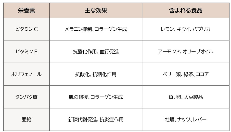 また、抗酸化作用の高いビタミンEやポリフェノールも、肌の酸化を防ぎ、透明感をキープするのに役立ちます。ナッツ類や緑黄色野菜、ベリー類がおすすめです。さらに、良質なタンパク質は肌の修復に必要不可欠。肌にハリを与えるコラーゲンの原料となるので、魚や大豆製品もバランスよく摂取しましょう。