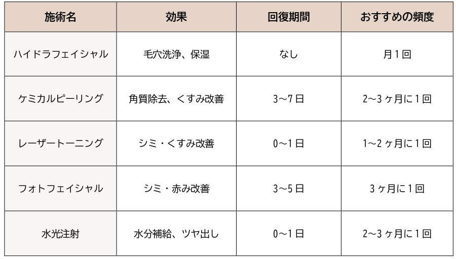 ハイドラフェイシャルは、吸引しながら美容成分を注入する施術で、毛穴の汚れを除去しながら肌に潤いを与えます。ケミカルピーリングは、古い角質を除去することで肌のターンオーバーを促進し、くすみを改善します。また、より強力なシミ対策としては、レーザートーニングやフォトフェイシャルなどの光治療も効果的です。