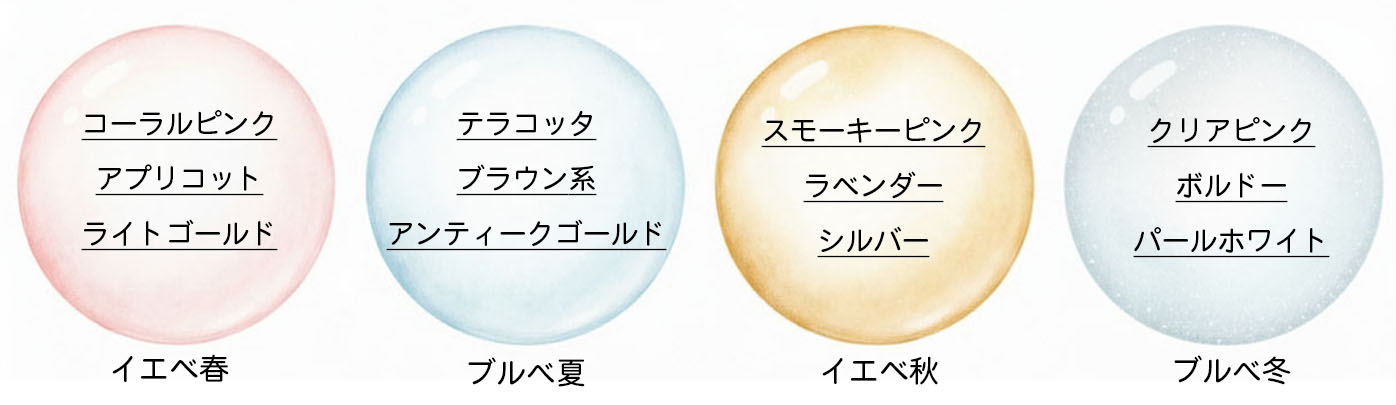 透明感カラーとは、肌の透明感を引き立てる色のことで、これは個人の肌色やパーソナルカラーによって異なります。一般的に、イエベ肌(イエローベース)とブルベ肌(ブルーベース)で選ぶべき色が変わってきます。自分に合ったパーソナルカラーを知ることで、より効果的に透明感を引き出せます。