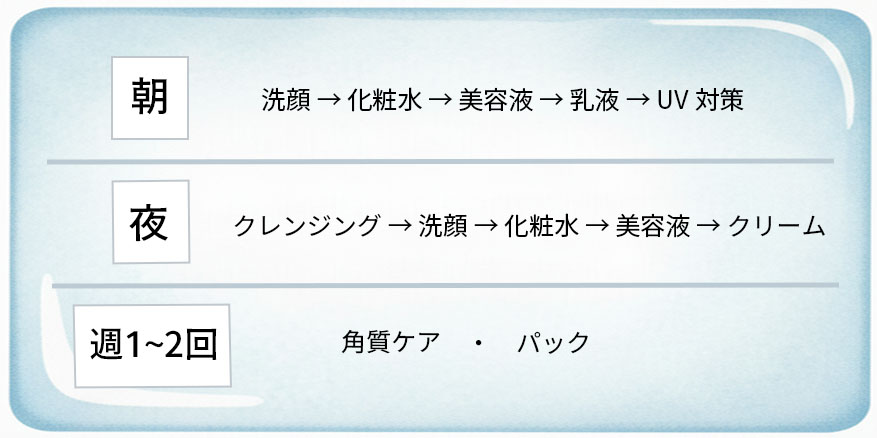朝晩のルーティンは若干異なります。朝は軽めのケアと紫外線対策、夜はしっかりとしたクレンジングと集中ケアがポイントです。週に1〜2回の角質ケアも効果的です。古い角質を取り除くことで、スキンケア成分の浸透率が高まり、より透明感のある肌に近づけます。