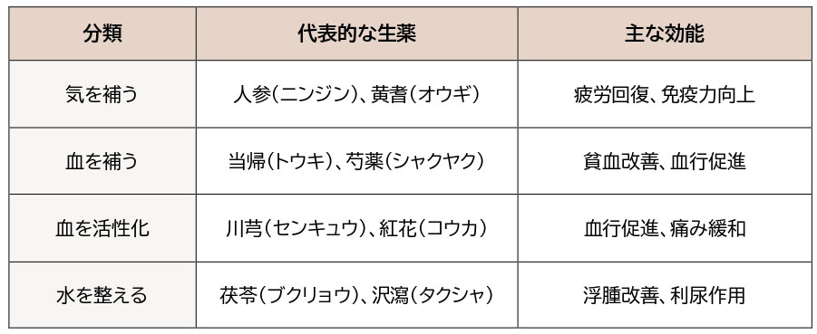 生薬は数百種類にも及びますが、それぞれに特徴的な効能があります。漢方では「気・血・水」という概念で生薬の働きを分類し、体質や症状に合わせて使い分けます。ここでは代表的な生薬の種類と、その効能について詳しく見ていきましょう。