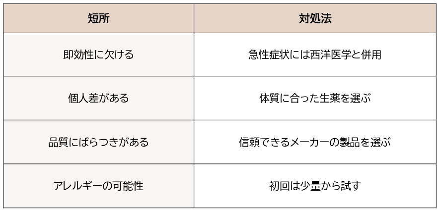 生薬の短所としては、効果の発現が緩やかで即効性に欠ける点が挙げられます。急性の強い症状には、西洋医学の治療と併用することが望ましい場合も多いでしょう。また、個人の体質や症状により効果に差があり、必ずしも万人に同じ効果をもたらすわけではありません。さらに、品質や有効成分の含有量が天然素材のため一定しないこともあります。生薬アレルギーの可能性もあるため、初めて使用する際は少量から試すことが推奨されます。
