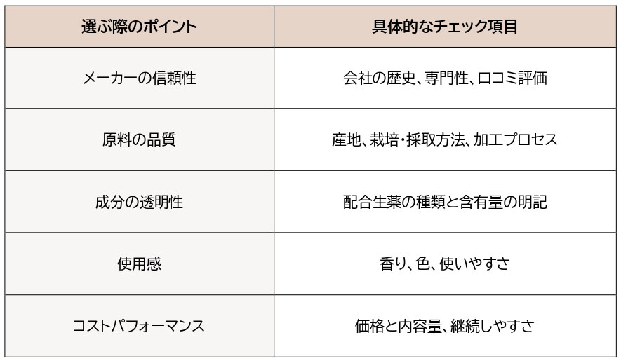 生薬製品を選ぶ際のポイントは、信頼性の高いメーカーの製品を選ぶことです。良質な原料を使用し、適切な製造工程を経た製品でなければ、期待する効果が得られない可能性があります。また、成分表示をチェックし、自分の体質や症状に合った生薬が含まれているかを確認しましょう。初めて使用する生薬製品は、まず少量から試し、体調の変化に注意することも大切です。生薬は自然由来ですが、アレルギー反応が出ることもあるため、異常を感じたら使用を中止し、必要に応じて専門家に相談しましょう。