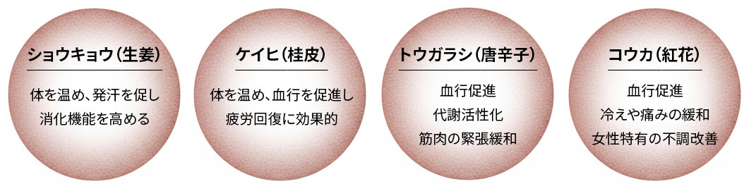 そんな方には、複数の生薬をバランスよく配合した「生薬の温巡浴」がおすすめです。ショウキョウやトウガラシなどの温性生薬が、入浴を通じて体を芯から温め、巡りを促進します。