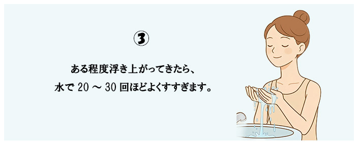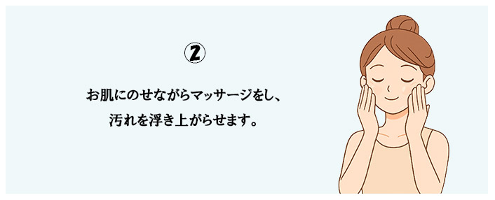 フェイスラインなど、ケアの行き届きにくい箇所に気を付けながらマッサージしつつ汚れを浮き上がらせます。そしてそのあと水やぬるま湯などで洗い流したらお手入れ終了。