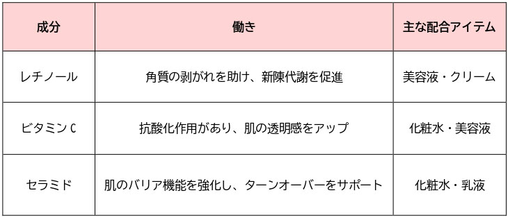 特にレチノールやビタミンCはターンオーバー促進に効果的ですが、敏感肌の方は低刺激処方のものを選ぶのがおすすめです。