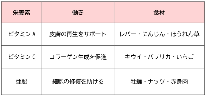 特に以下の栄養素を意識して摂取することで、肌の再生をサポートできます。