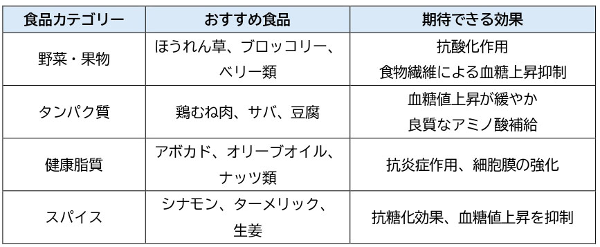糖化の進行を抑えるためには、日々の食生活と生活習慣の見直しが重要です。糖化は血糖値の急上昇によって促進されるため、何をどう食べるかがポイントになります。ここでは糖化を防ぐ具体的な対策と効果的な食品について解説します。