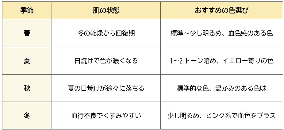 季節によって肌の色は変化するため、一年中同じファンデーションを使うのは適切ではありません。夏は日焼けの影響で肌が黒くなりがちなので、通常より1〜2トーン暗めの色を選ぶとよいでしょう。逆に冬は血行が悪くなってくすみやすいため、少し明るめの色を選ぶのがおすすめです。