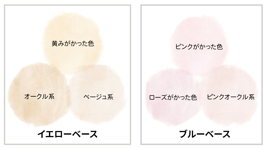 ファンデーション選びでは、自分の肌色だけでなく、パーソナルカラーとも重要な要素です。パーソナルカラーとは、あなたに最も似合う色のこと。大きく分けて、イエローベースとブルーベースの2タイプがあります。