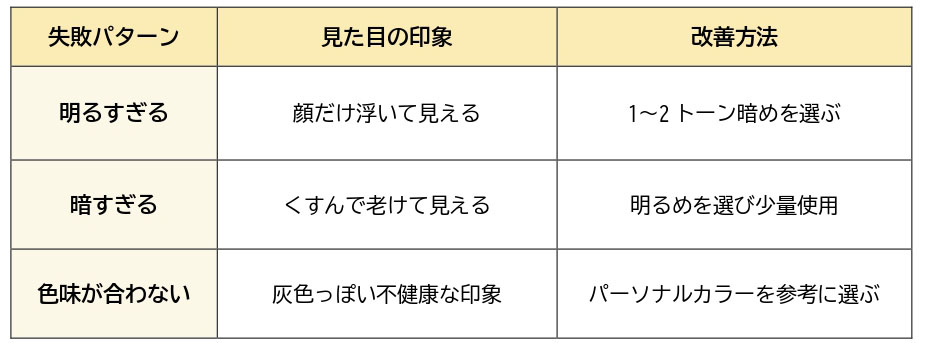明るすぎる色を選んでしまった場合は、顔の外側から内側に向かって薄く伸ばす方法が有効です。また、ブロンザーを使って輪郭を暗くし、バランスを取ることもできます。
