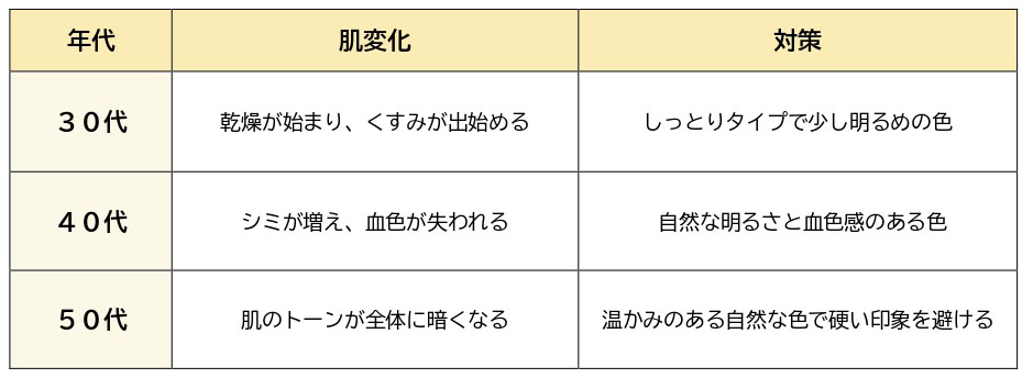 年齢とともに変化する肌には、年代に合ったファンデーション選びが欠かせません。「以前使っていた色が合わなくなった」「シミやくすみが気になるようになった」という変化を感じていませんか?